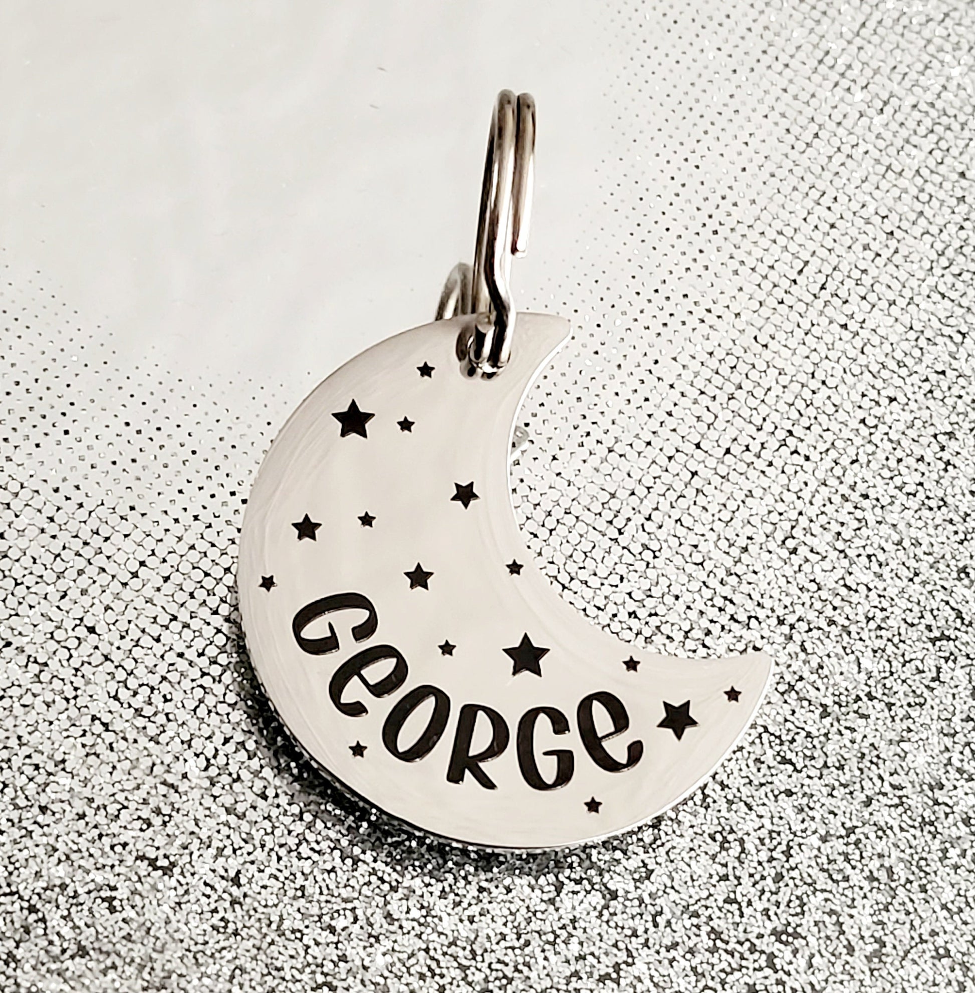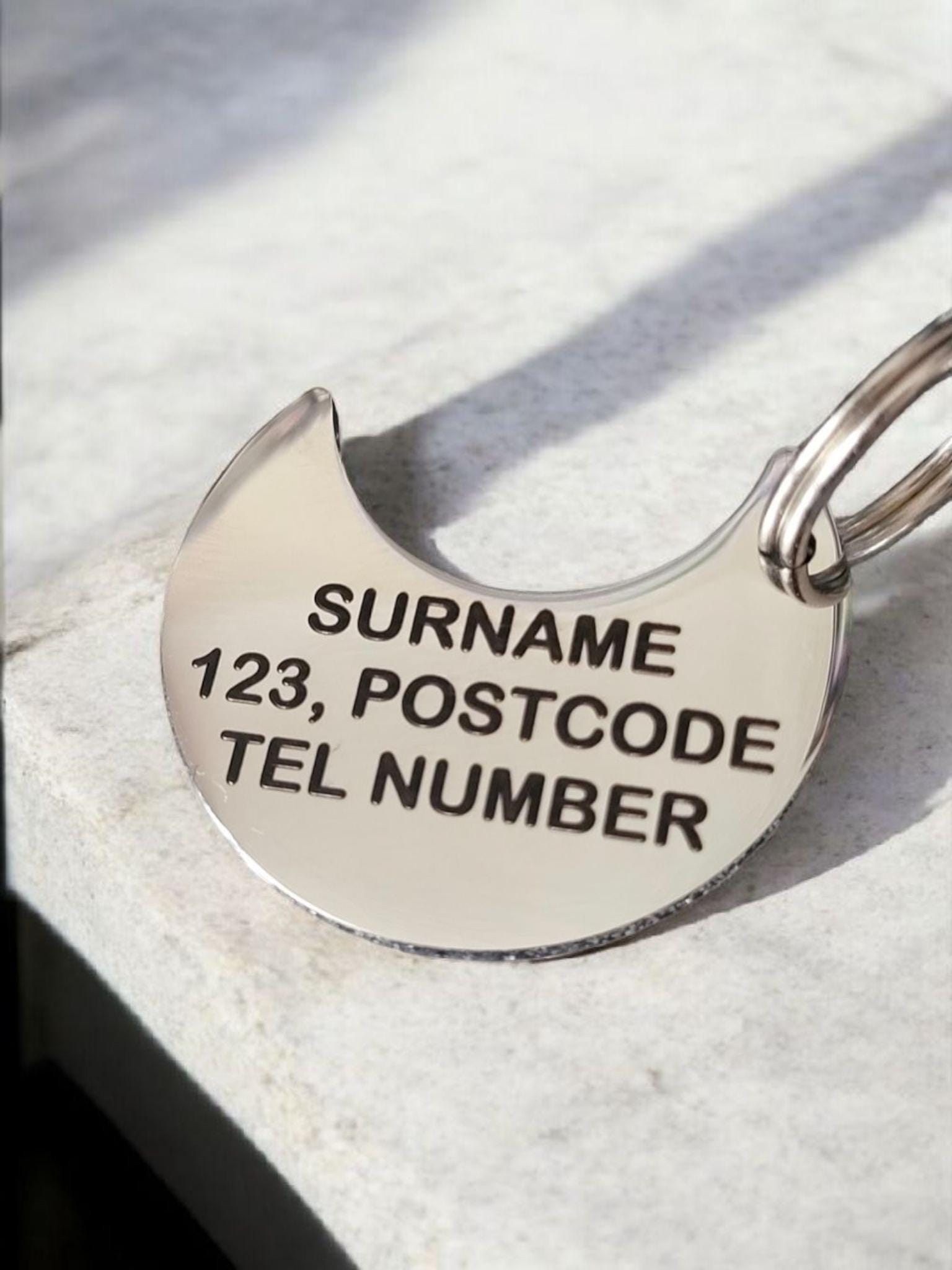 30mm Moon shape Pet ID tag. ID information on the back. Laser engraved.