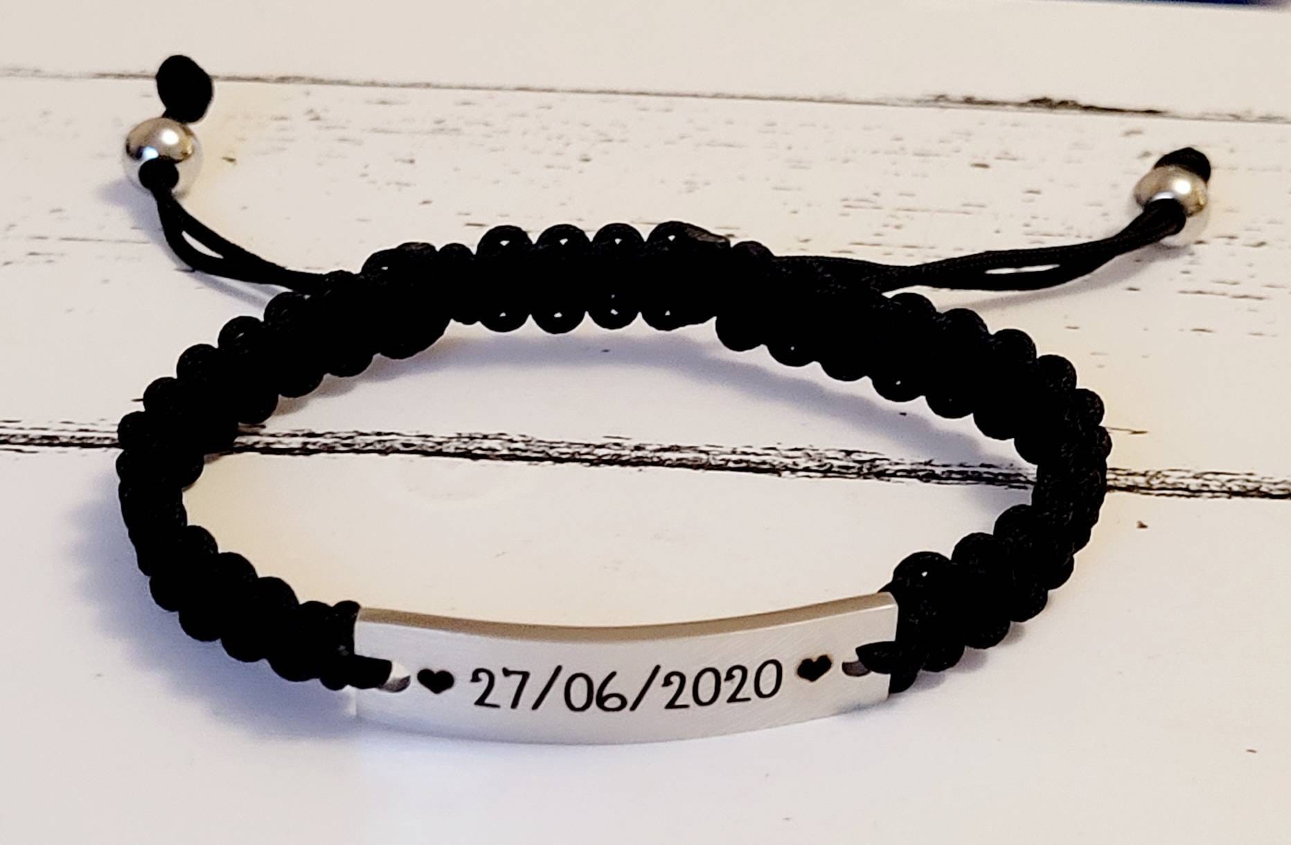 A stylish and meaningful keepsake for anyone special — this fully adjustable woven cord bracelet features a sleek stainless steel plate that can be engraved with any text, name, initials, date, or short message of your choice.