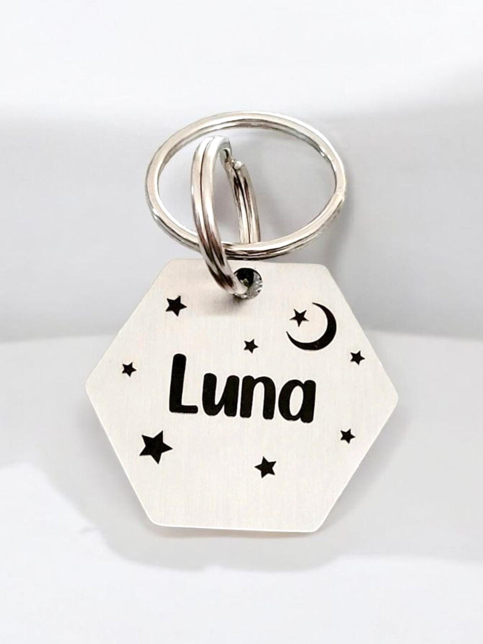 Beautiful star design stylish 30mm hexagon pet ID tag. Available in silver, gold, rose gold, blue or black Steel.