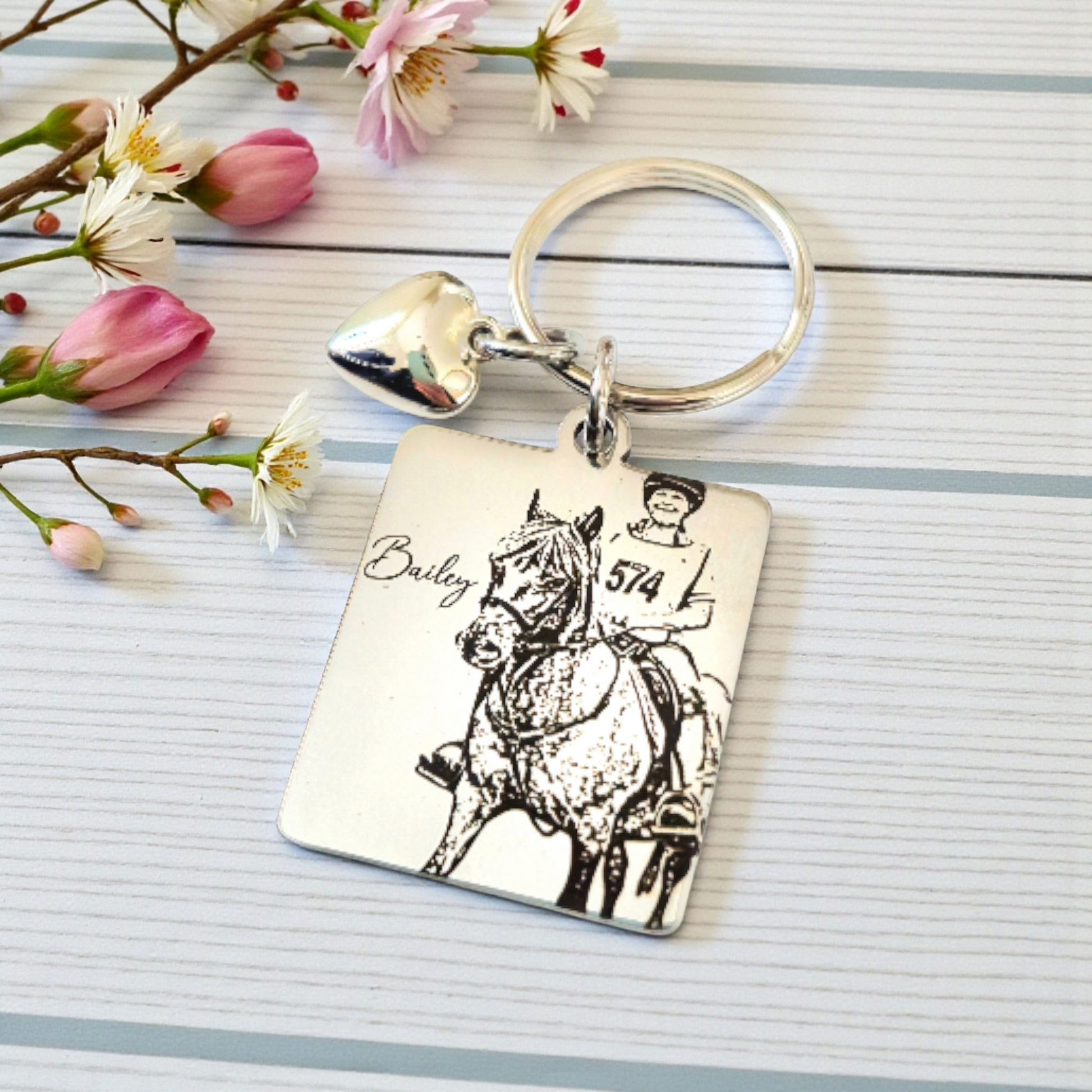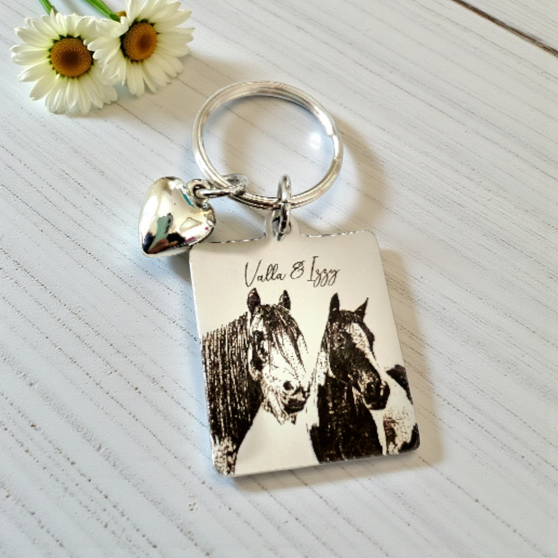 Crafted from high-quality stainless steel with a sturdy split ring and a sweet little heart charm, this engraved keyring turns your favourite equine photo into a keepsake you’ll treasure forever.