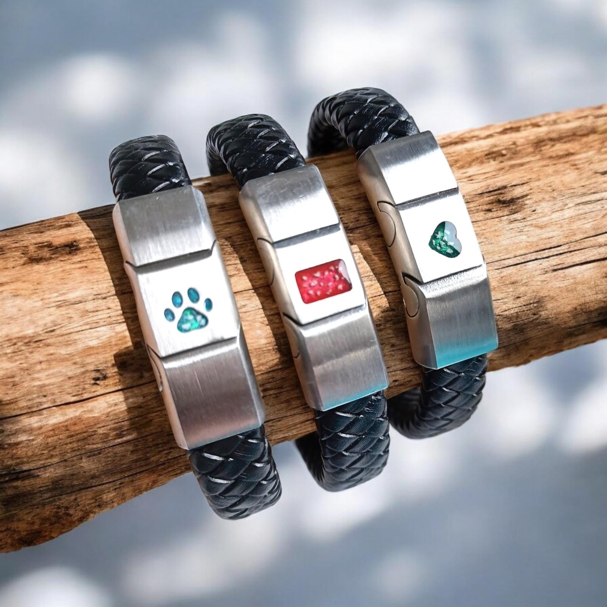 Cremation Ashes or Hair memorial leather bracelet. Engraved on the back. 40 colours to choose from. Made to measure. Unisex. Resin jewellery