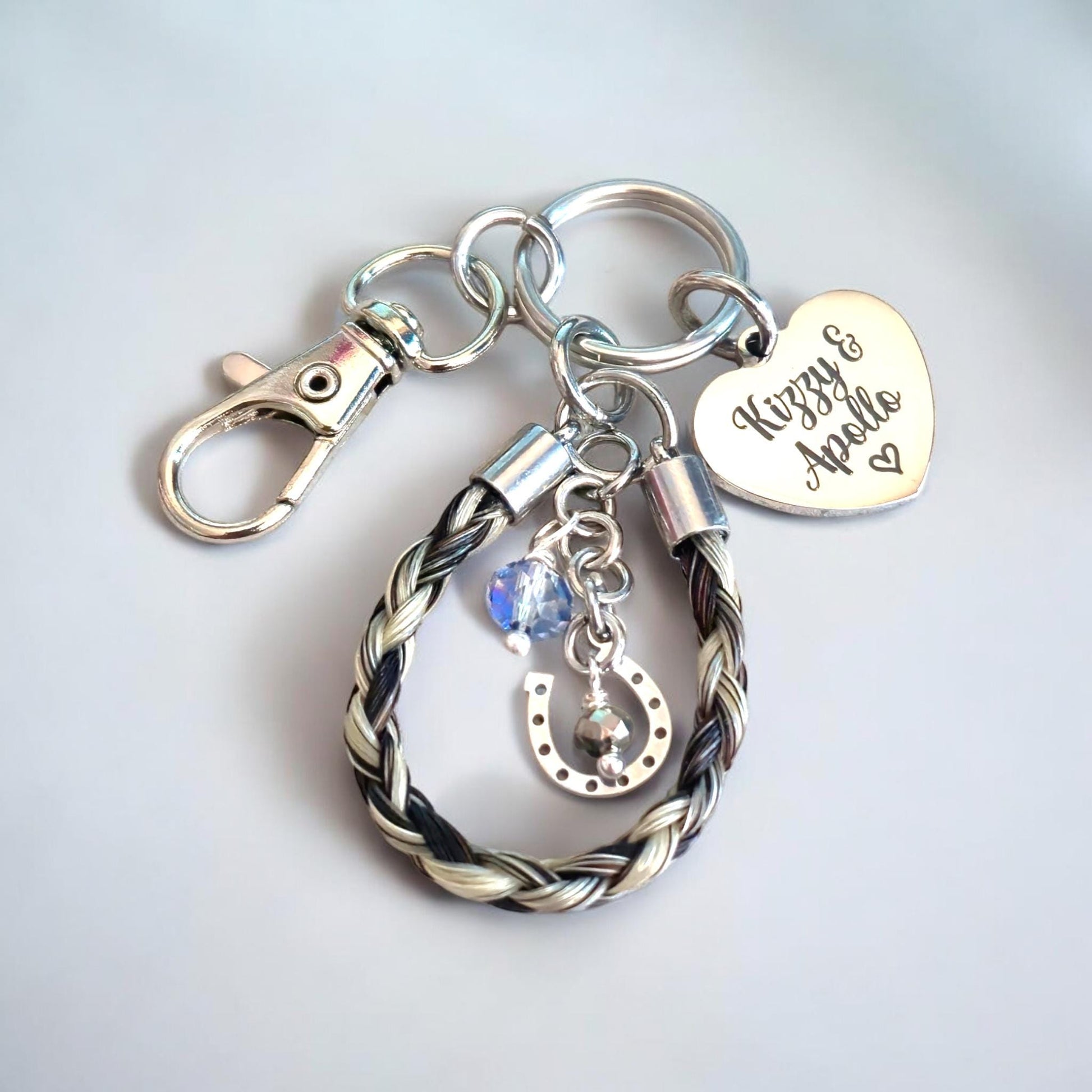 Horse hair / tail woven Keyring with engraved heart fob. Text or photo engraved