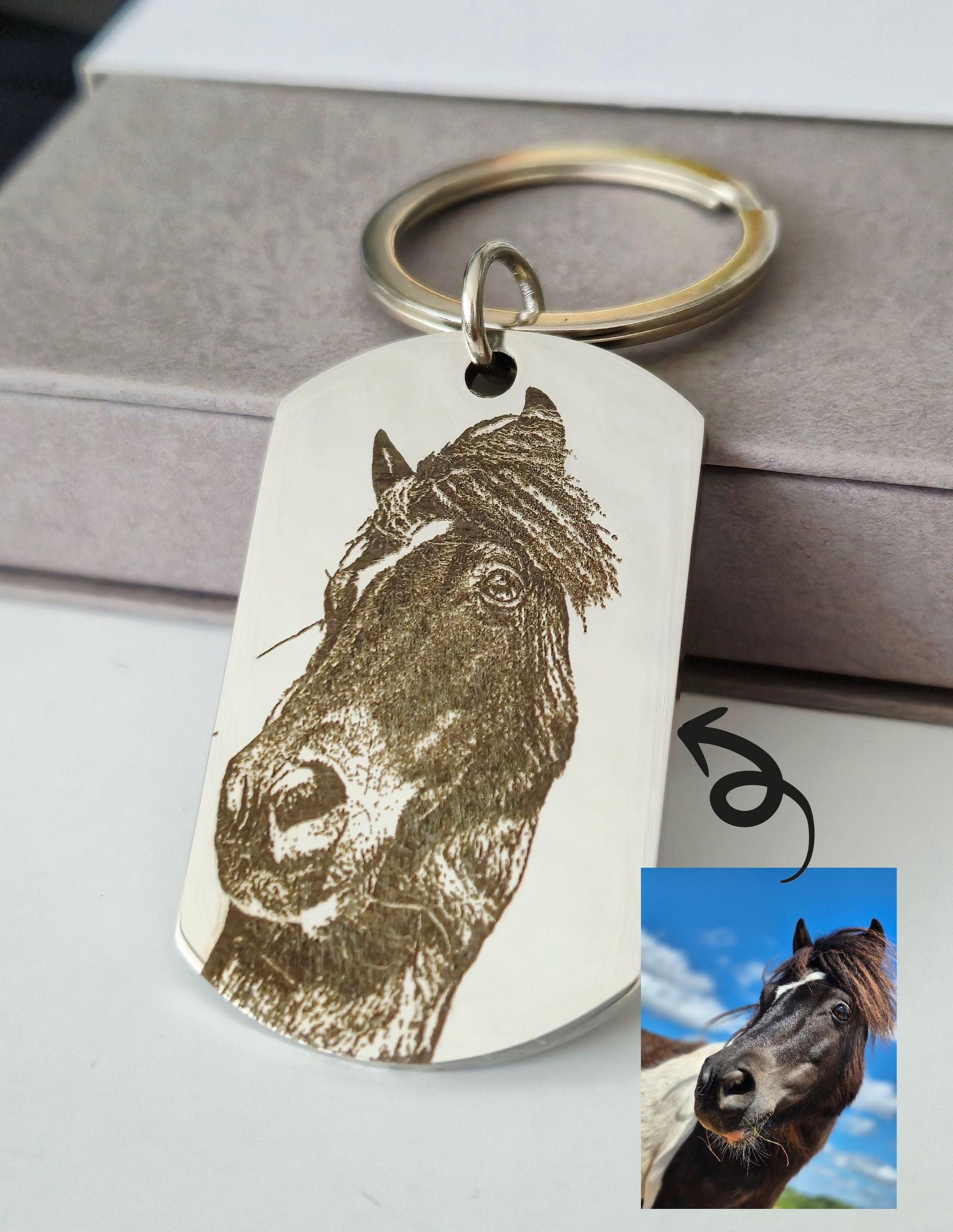 Laser Engraved photo keyring. Engraved from any clear image. Horse, Pony, Donkey, Equine, Equestrian.