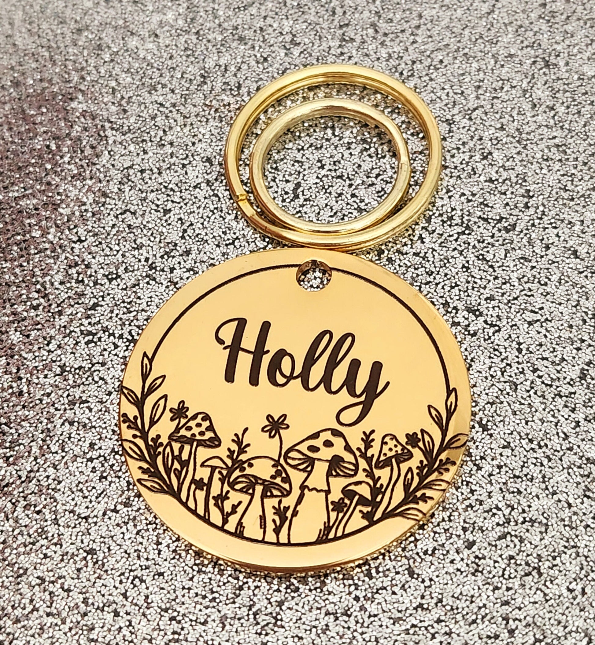 Luxury mushroom design pet ID tag, dog tag, collar tag, cat tag, various colours, engraved