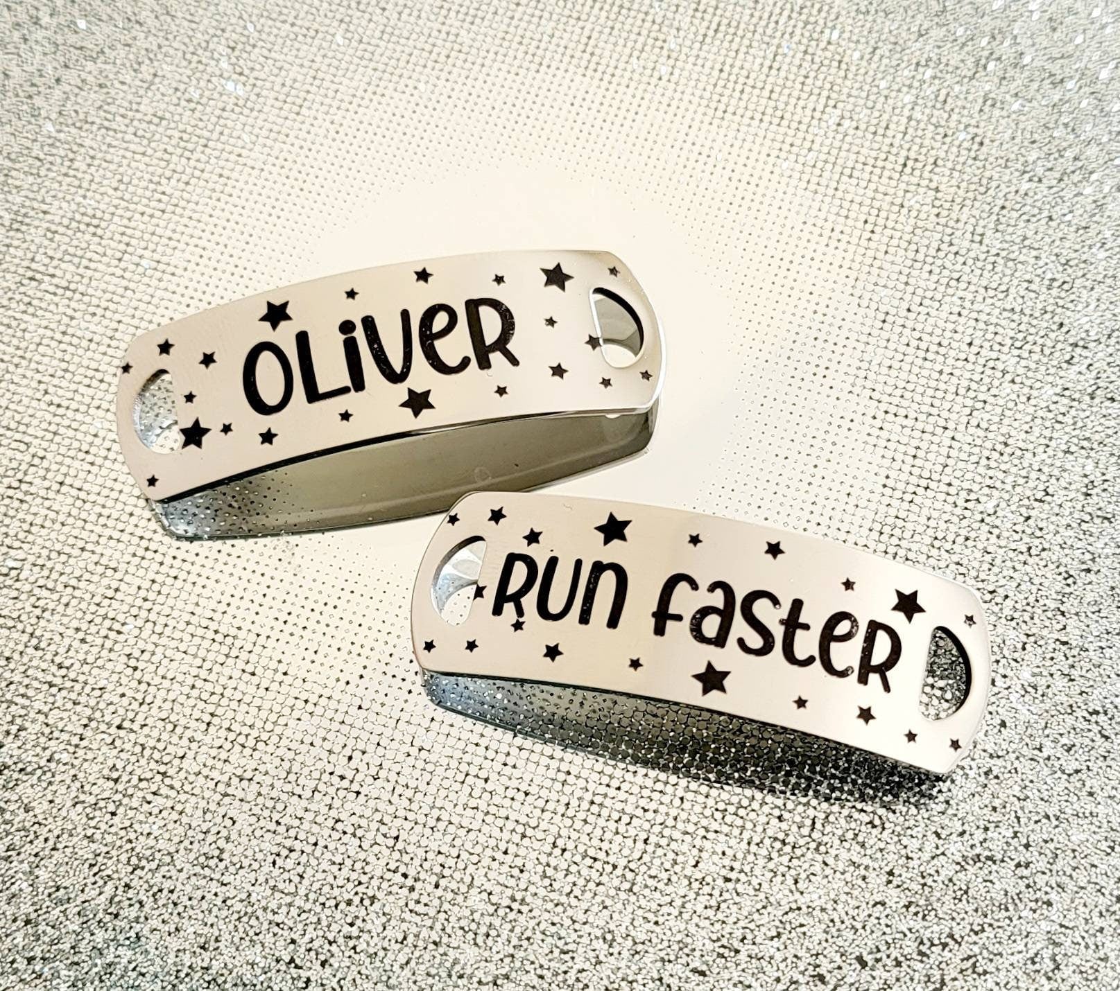 These stainless steel trainer tags come as a pair with the engraving of your choice.