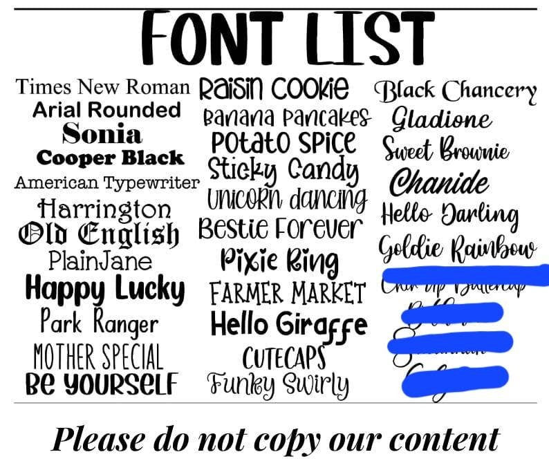 ☆☆☆If you do not state a font for the front we will use the one in the main photo sample for this listing☆☆☆