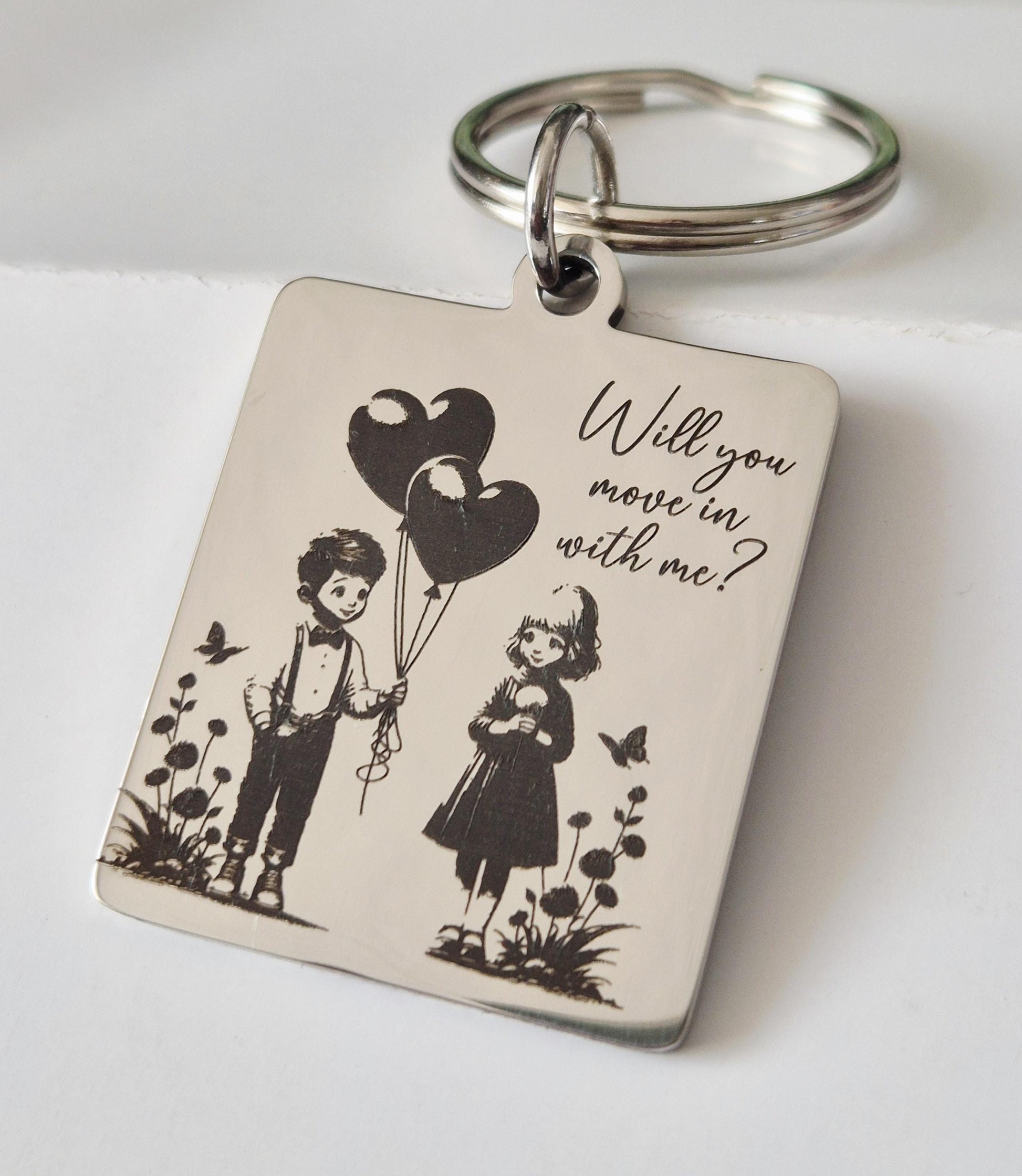 Will You Move In With Me Keyring – Cute Couple Design, 30x32mm Stainless Steel Engraved Rectangle, Romantic Proposal Gift, Couples Keychain